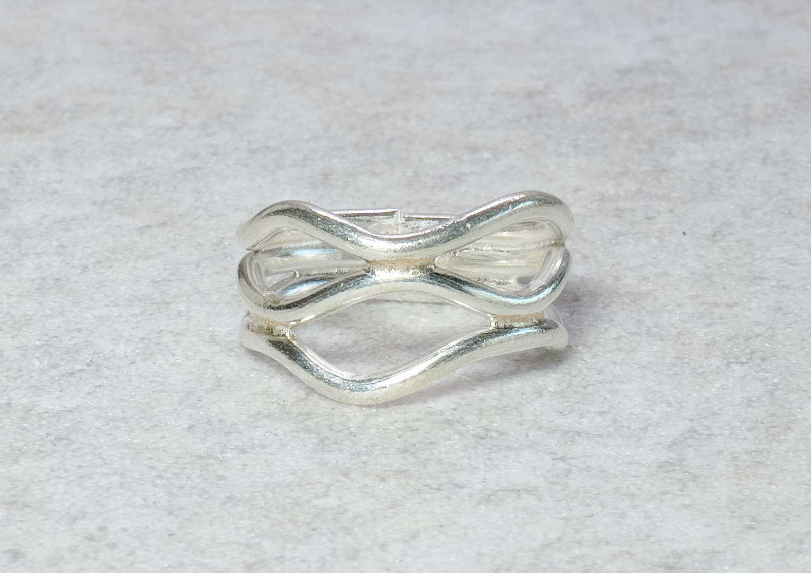 成形した銀をハンマーで叩きながら薄く伸ばし、リングやバングルの形に近づけていきます。この工程は力加減と経験がものをいう作業で、叩く回数や角度によって仕上がりの硬さや質感が変わります。